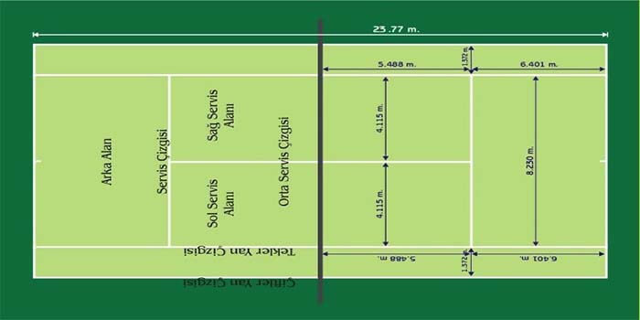 • Tenis kortunun sağ ve solunda yer alan boylamasına çizgiler ise tekler ve çiftler alanını belirler.
